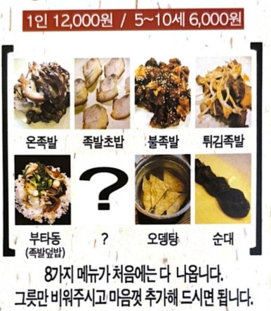 족발 포함한 8종의 메뉴는 성인기준 1인 12000원 인데