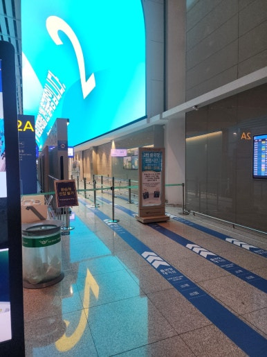 1출국장 줄이 길어서 저 줄을 기다리느니 2출국장 오픈런을 하고자 맨 앞에 줄을 서 있었어요.