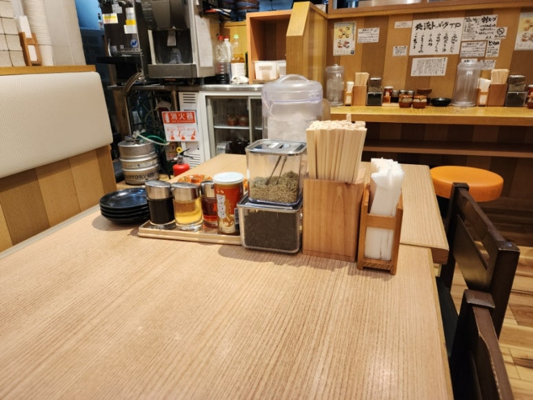 테이블에는 젓가락과 냅킨,간장,시치미 등 라멘에 넣어먹을 수 있는 양념들이 있었습니다.
